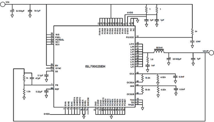 The ISL70002SEH is a radiation hardened and SEE hardened high-efficiency monolithic, synchronous buck regulator with integrated MOSFETs. This single-chip power solution operates over an input voltage range of 3V to 5.5V and provides a tightly regulated output voltage that is externally adjustable from 0.8V to ~85% of the input voltage. Output load current capability is primarily determined by PVIN voltage with up to 22A for a single IC at PVIN ≤ 5. 5V for TJ ≤ +125°C. Two ISL70002SEH devices, configured to current share, can provide up to 38A of total output current at PVIN ≤ 5. 5V for TJ ≤ +125 °C assuming ±27% worst-case current share accuracy. The ISL70002SEH uses peak current-mode control with integrated error amp compensation and pin-selectable slope compensation. Switching frequency is also pin selectable to either 1MHz or 500kHz. Two devices can be synchronized 180° out-of-phase to reduce input RMS ripple current. High integration makes the ISL70002SEH an ideal choice to power small form factor applications. Two devices can be synchronized to provide a complete power solution for large-scale digital ICs, like field-programmable gate arrays (FPGAs) that require separate core and I/O voltages.