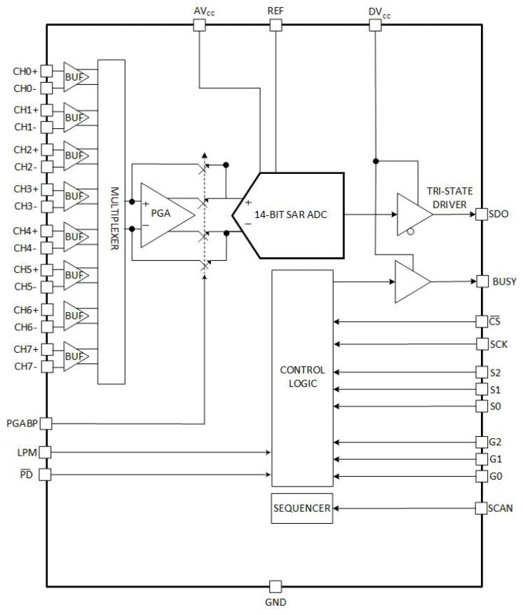 - 8 个缓冲差分模拟输入通道,带多路复用器