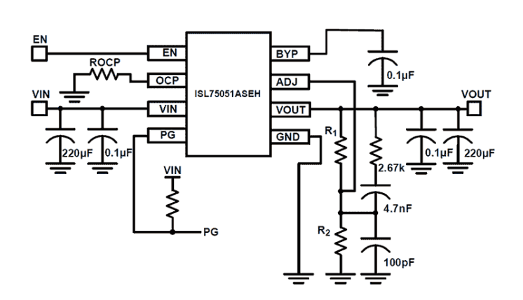 The ISL75051ASEH and ISL73051ASEH are radiation hardened low-voltage, high-current, single-output LDOs specified for up to 3.0A of continuous output current. These devices operate across an input voltage range of 2.2V to 6.0V and can provide output voltages of 0.8V to 5.0V adjustable, based on the resistor divider setting. Dropout voltages as low as 65mV can be achieved using the device. The OCP pin allows the short-circuit output current limit threshold to be programmed by a resistor from the OCP pin to GND. The OCP setting range is 0.5A minimum to 8.5A maximum. The resistor sets the constant current threshold for the output under fault conditions. The thermal shutdown disables the output if the device temperature exceeds the specified value. It subsequently enters an ON/OFF cycle until the fault is removed. The ENABLE feature allows the part to be placed into a low current shutdown mode that typically draws about 10µA. These devices are optimized for fast transient response and Single Event Effects (SEE). This reduces the magnitude of Single Event Transients (SET) seen on the output. Additional protection diodes and filters are not needed. These devices are stable with tantalum capacitors as low as 47µF and provide excellent regulation all the way from no load to full load. Programmable soft-start allows the user to program the inrush current by using the decoupling capacitor value on the BYP pin.