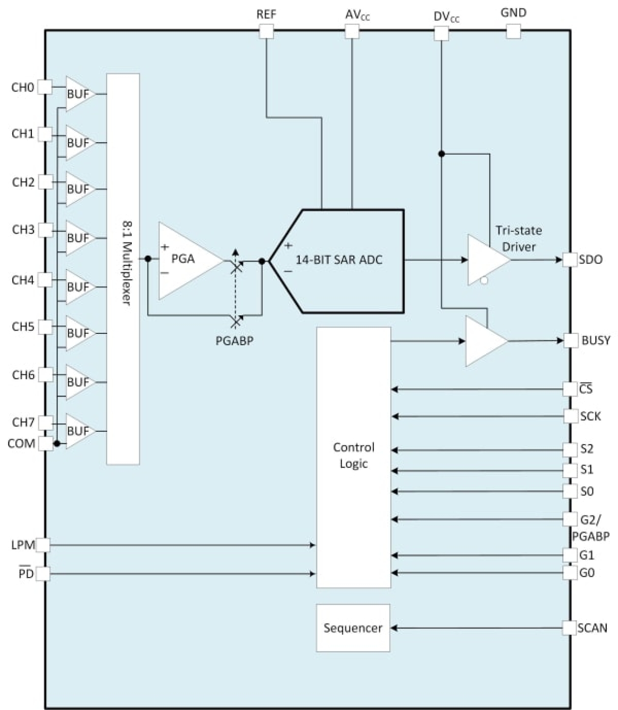 - 900kSPS throughput rate with PGA bypass 480ksps with the PGA enable all with no data latency