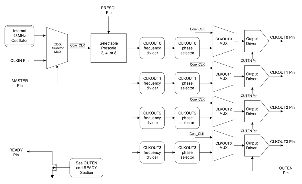 Configuration is supported via hardware selection pins or through an I²C/SMBus interface, offering both fixed and dynamic programmability to meet a range of design needs.