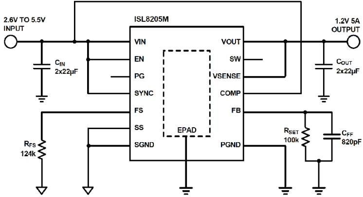 The ISL8205M power module is a single channel synchronous step-down complete power supply, capable of delivering up to 5A of continuous current. Operating from a single 2.6V to 5.5V input power rail and integrating controller, power inductor and MOSFETs, the ISL8205M only requires a few external components to operate and is optimized for space constrained and portable battery operated applications. Based on current mode PWM control scheme, the ISL8205M provides a fast transient response and excellent loop stability as well as a very low duty cycle with an adjustable output voltage as low as 0.6V and better than 1.6% accuracy over line and load conditions. Operation frequency is selectable through an external resistor, with a 1.8MHz default setting, or may be synchronized with an external clock signal up to 3.5MHz. The ISL8205M also implements a selectable PFM mode to improve light-load efficiency and a 100% duty cycle LDO mode to extend battery life. A programmable soft-start reduces the inrush current required from the input supply while an automatic output discharge ensures a soft stop. Dedicated enable pin and power-good flag allow for easy system power rails sequencing. An array of protection features, including input Undervoltage Lockout (UVLO), over-temperature, overcurrent/short-circuit with hiccup mode, overvoltage and negative overcurrent, guarantees safe operations under abnormal operating conditions. The ISL8205M is available in a compact RoHS compliant 22 Ld 4.5x7.5x1.85mm QFN package.