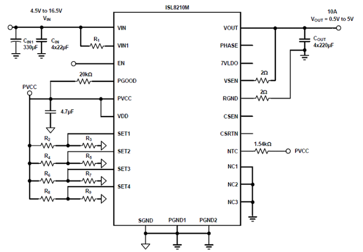 The ISL8210M power module is a single channel, synchronous step-down, non-isolated complete power supply featuring the proprietary Renesas R4™ Technology. The module supports a wide 4. 5V to 16. 5V input voltage range and a wide 0. 5V to 5V output range capable of delivering up to 10A of continuous current and is optimized for high power density. Integrated LDOs provide module bias voltage, allowing for single supply operation. The proprietary Renesas R4 control scheme has extremely fast transient performance, accurately regulated frequency control, and all internal compensation. An efficiency enhancing PFM mode greatly improves light-load efficiency. The ISL8210M allows for easy R4 loop optimization, resulting in fast transient performance across a wide range of applications, including all ceramic output filters. The power module integrates all power and most passive components and requires only a few external components to operate. A set of optional external resistors provides very flexible configuration options (such as frequency, VOUT, and AV gain). The ISL8210M also features remote voltage sensing and completely eliminates any potential difference between remote and local grounds, improving regulation and protection accuracy. A programmable soft-start reduces the inrush current from the input supply. A precision enable input and power-good (PGOOD) flag are available to coordinate the start-up of the ISL8210M with other voltage rails, which is especially useful for power sequencing. Excellent efficiency and low thermal resistance permit full power operation without heatsinks. Input Undervoltage Lockout (UVLO), over-temperature, overcurrent, output overvoltage, and output prebias start-up protections ensure safe operations under abnormal operating conditions. The ISL8210M is available in a compact RoHS compliant thermally-enhanced 12mmx11mmx5. 3mm HDA package.