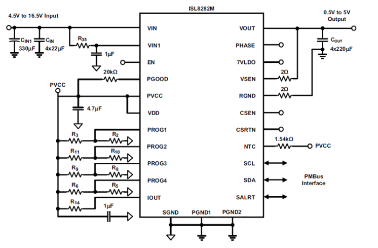 The ISL8282M is a PMBus enabled DC/DC single channel step-down power supply featuring the proprietary Renesas R4™ Technology. The module supports a wide 4. 5V to 16. 5V input voltage range and a wide 0. 5V to 5V output range capable of delivering up to 15A of continuous current. The ISL8282M achieves up to 95% conversion efficiency and is optimized for high power density. Integrated LDOs provide module bias voltage allowing for single supply operation. The ISL8282M includes a SMBus/PMBus/I2C interface for device configuration, telemetry (VIN, VOUT, IOUT, and temperature), and fault reporting. The proprietary Renesas R4 control scheme has extremely fast transient performance, accurately regulated frequency control, and all internal compensation. An efficiency enhancing PFM mode greatly improves light-load efficiency. The ISL8282M's serial bus allows for easy R4 loop optimization that results in fast transient performance across a wide range of applications including all ceramic output filters. The ISL8282M has four 8-bit configuration pins that provide very flexible configuration options (such as frequency, VOUT, and AV gain) without the need for built-in NVM memory. As a result, the design flow closely matches traditional analog modules while still offering the design flexibility and feature set of a digital SMBus/PMBus/I2C interface. The ISL8282M features remote voltage sensing, completely eliminates any potential difference between remote and local ground, and improves regulation and protection accuracy. A precision enable input coordinates the startup of the ISL8282M with other voltage rails and is especially useful for power sequencing. The ISL8282M integrates all power and most passive components to minimize the external components and significantly reduce design complexity and board space. The ISL8282M is available in a low-profile, thermally enhanced, compact 12mmx11mmx5. 3mm fully encapsulated HDA package.