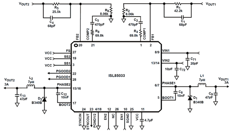 The ISL85033 is a dual standard buck regulator capable of 3A per channel continuous output current. With an input range of 4. 5V to 28V, it provides a high frequency power solution for a variety of point of load applications. The PWM controller in the ISL85033 drives an internal switching N-Channel power MOSFET and requires an external Schottky diode to generate the output voltage. The integrated power switch is optimized for excellent thermal performance up to 3A of output current. The PWM regulator switches at a default frequency of 500kHz and it can be user programmed or synchronized from 300kHz to 2MHz. The ISL85033 utilizes peak current mode control to provide flexibility in component selection and minimize solution size. The protection features include overcurrent, UVLO and thermal overload protection. The ISL85033 is available in a small 4mmx4mm Thin Quad Flat No-Lead (TQFN) Pb-free package.