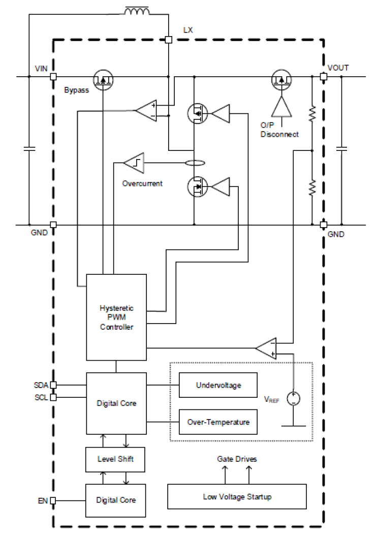 ISL9116B 具有自动旁路功能,适用于输入电压高于输出电压的情况。 该器件能够提供高达 450mA 的输出电流 (VIN = 4.5V,VOUT = 5.0V),并由于其自适应频率滞环控制架构而效率出色。