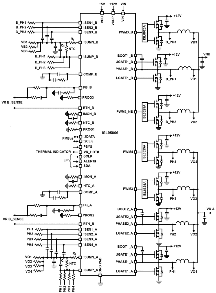 Compliant with Intel IMVP8™, the ISL95866 provides a complete power solution for desktop microprocessors supporting the core (IA), graphics (GT), or unsliced graphics (GTUS or GTX). The controller provides control and protection for two Voltage Regulators (VR). The first VR can be configured for 4-, 3-, 2-, or 1-phase operation. The second VR is configurable for 3-, 2-, or 1-phase operation. The VRs feature a programmable SVID address to allow maximum flexibility in supporting desktop processor SKUs. Both controller outputs share a common serial control bus to communicate with the CPU and achieve lower cost and smaller board area compared with a two-chip approach. Based on Intersil’s Robust Ripple Regulator R3™ technology, the R3™ modulator has many advantages compared to traditional modulators. These include faster transient settling time, variable switching frequency in response to load transients and improved light-load efficiency due to diode emulation mode with load-dependent low switching frequency. The ISL95866 has several other key features. The controller features three integrated +12V gate drivers with two on the VR A output. The controller supports either DCR current sensing with a single NTC thermistor for DCR temperature compensation or more precision through resistor current sensing if desired. Both outputs feature remote voltage sense, programmable IMAX, adjustable switching frequency, OC protection, and single VR_READY power-good indicator. The ISL95866 features an SMBus interface, which supports enabling or disabling droop, output voltage offset adjustment, and disabling of OVP and OCP protections.
