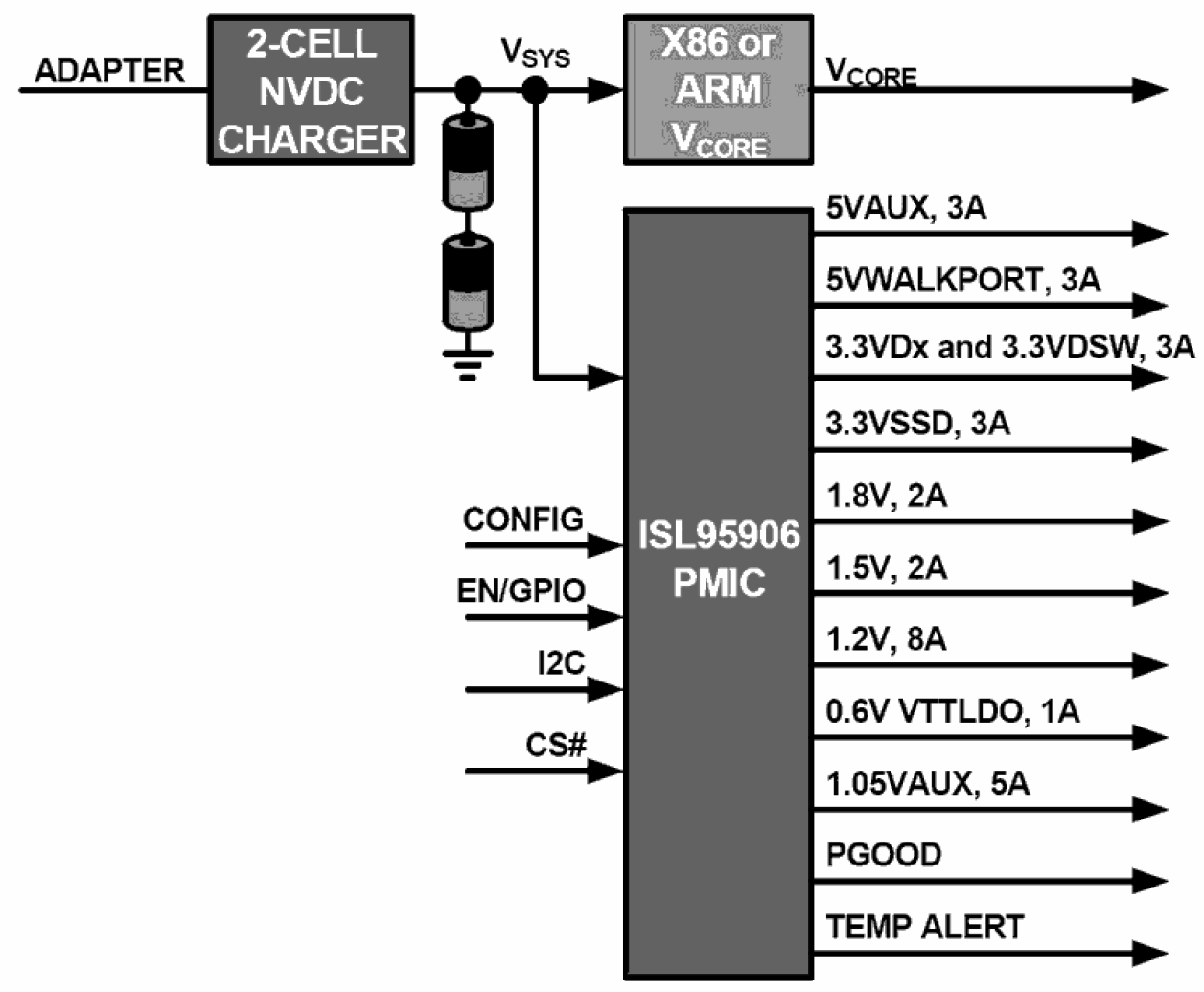 The ISL95906 is a Power Management Integrated Circuit (PMIC) for ultrabook, notebook and tablet computers powered by 2-cell Li-ion batteries. It integrates control, MOSFET drivers, power MOSFETs, fault protection and fault monitoring functions for 8 highly efficient, synchronous buck regulators and VTT LDO. It is offered in a thermally efficient 5.5mm x 5.5mm, 121 bump, 0. 5mm pitch WLCSP package. The PMIC regulators convert system voltage from the battery or adapter into all platform voltages needed for a typical computer system including 5V and 3.3V system regulators, 1.8V, 1.5V, 1.05V for controller-hub, peripheral and core voltages as well as programmable VDDQ and VTT regulators for DDR3/3U/3L, LPDDR3 and DDR4 voltages. The switching regulators operate at 1MHz and are based on Intersil’s proprietary R4™ Technology, which provides high light-load efficiency, fast transient response, seamless DCM/CCM transitions and requires no external compensation. The PMIC provides overcurrent, overvoltage and over-temperature fault protections and undervoltage and over-temperature warnings. A temperature alert signal indicates the PMIC is operating at an elevated temperature and ALERT indicates if any other fault or warning has occurred. The PMIC also offers significant I2C capability and can be configured to provide 8 GPIO pins for additional system functionality and each regulator has an independent power-good indicator.
