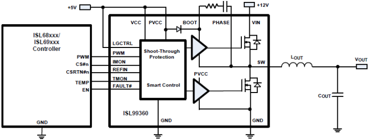 ISL99360 和 ISL99360B 具有兼容 3.3V 和 5.0V 的三态 PWM 输入,与瑞萨的多相 PWM 控制器配合使用,可在异常工作条件下提供可靠的解决方案。 ISL99360 和 ISL99360B 还集成了 UVLO、HFET 短路、过热和过流的故障保护来提高系统性能和可靠性。 漏极开路故障报告引脚简化了 SPS 和控制器之间的握手过程,并可在启动和故障条件下禁用控制器。