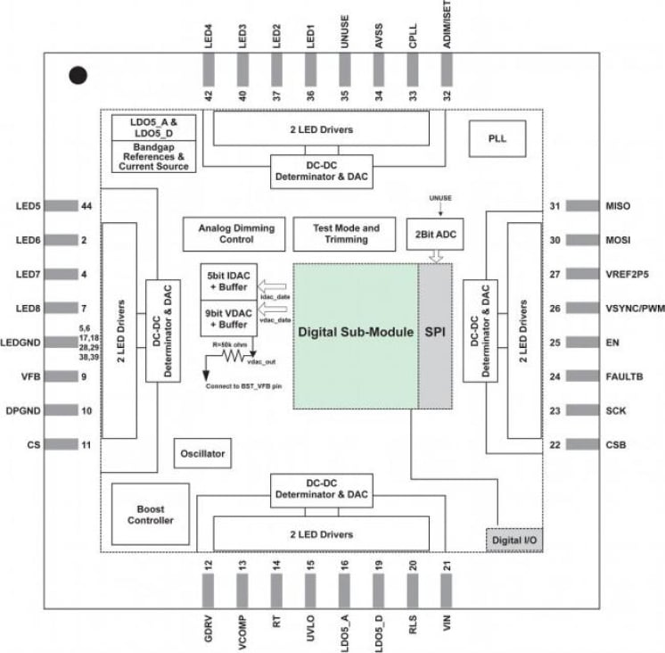 - LED drivers – LED open detection, LED short fault protection, over-temperature shutdown