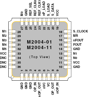 The M2004 variants -01 and -11 are Voltage Controlled SAW Oscillator (VCSO) based clock generator PLLs designed for clock frequency translation and jitter attenuation in a high-speed data communications system. The clock multiplication ratio and output divider ratio are pin-selectable and also configurable through serial programming. External loop components allow the tailoring of PLL loop response. The M2004-11 adds Hitless Switching with Phase Build-out (HS/PBO) to ensure that reference clock reselection does not disrupt the output clock.