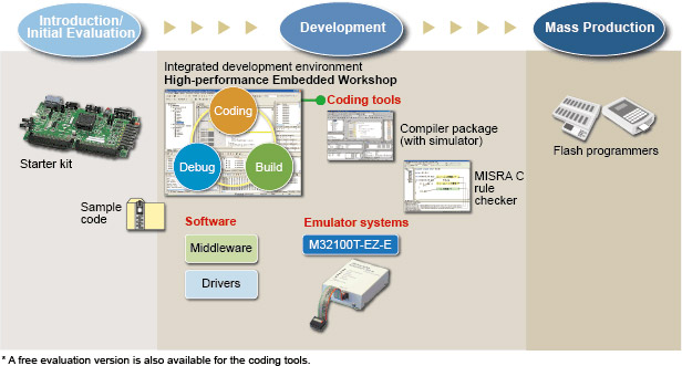 • The Renesas IDE High-Performance Embedded Workshop seamlessly integrates development tools such as a compiler and an emulator. It improves the efficiency of the Coding-Build-Debug* cycle.
