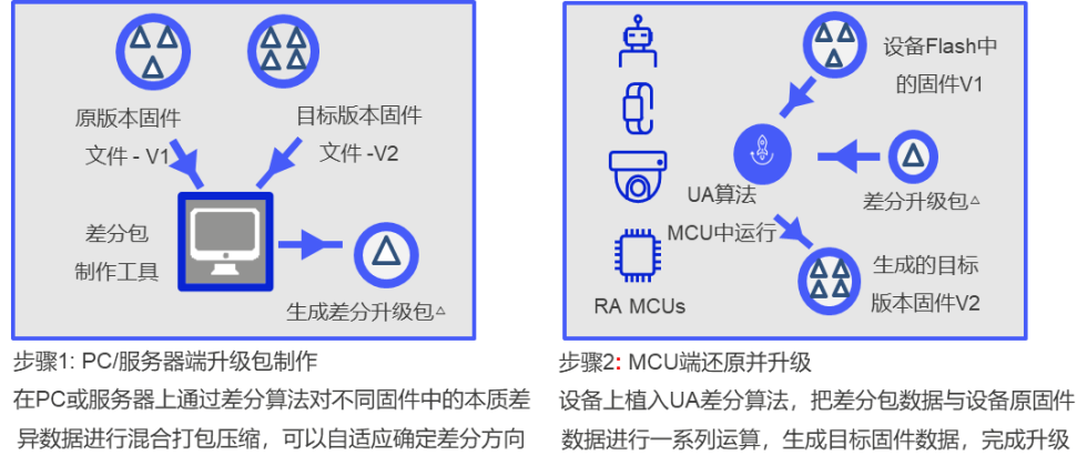 UA是艾拉比差分算法的软件产品,以库文件形式提供给客户,并集成在MCU的Bootloader中差分升级又叫增量升级,顾名思义就是通过差分算法将源版本与目标版本之间差异的部分提取出来制作成差分包,然后在设备通过还原算法将差异部分在源版本上进行还原从而升级成目标版本的过程。艾拉比差分算法已经支持瑞萨RA产品家族MCU。
