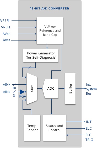 The ADC12 can be triggered from multiple internal and external sources, such as external trigger pins, ELC, PWM, or software. Built-in ADC diagnostics verify the module’s functionality at the beginning of each scan, ensuring accurate conversion values.