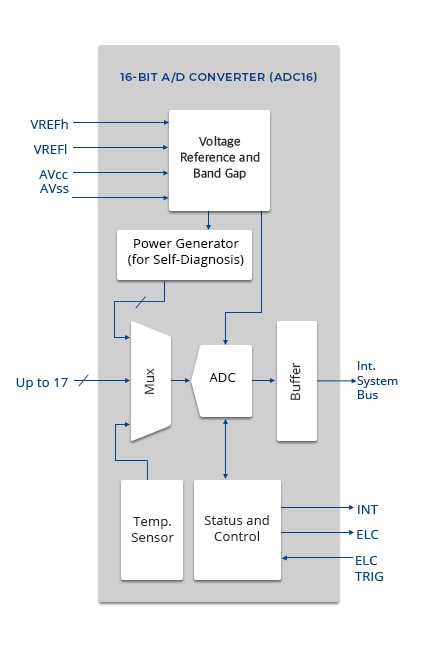 The ADC16 can be triggered from multiple internal and external sources, such as external trigger pins, ELC, PWM, or software. Built-in ADC diagnostics verify the module’s functionality at the beginning of each scan, ensuring accurate conversion values.