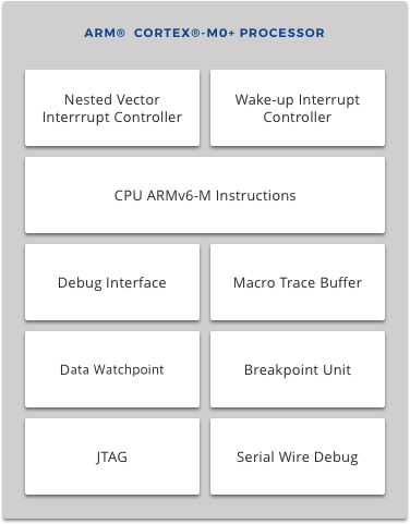Combining several low power modes and flexible power control over system components, the 32-bit Arm® Cortex®-M0+ is ideal for applications requiring long battery life. Fast code execution permits longer sleep time, while optimized code fetching reduces flash and ROM power consumption. The processor enables full system-level debug, while an integrated interrupt controller provides deterministic interrupt handling, enabling a fast response to real-time events. The processor is upward compatible with other Cortex®-M processors, providing enhanced scalability and code re-usability.