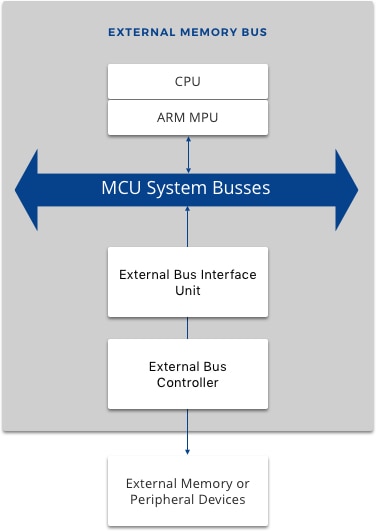 The Memory Protection Unit (MPU) safeguards designated regions of memory from unauthorized read or write attempts. The Memory Mirror Function (MMF) provides the flexibility to virtually re-map the address of sections of code flash to facilitate robust firmware updates. A memory bus allows the MCU to access external memory and devices.