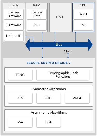 These features leverage a variety of National Institute of Standards and Technology (NIST)-compliant cryptographic algorithms, such as the Advanced Encryption Standard (AES) 128/256 protocol. Security features also include true random number generation to create secure cryptographic keys, and hash generation functions to ensure data integrity.
