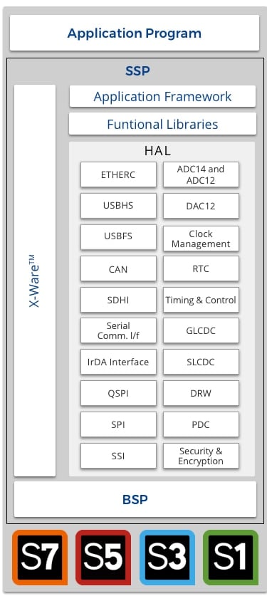 SSP使用Express Logic开发的多个X-Ware™组件:ThreadX® RTOS、NetX™ IPv4和NetX Duo™ TCP/IP堆栈、NetX Secure™、USBX™ USB主机/设备协议堆栈、FileX® MS-DOS兼容文件系统和GUIX™图形运行时间库。SSP中的一系列应用程序框架简化了最终应用程序的使用程序。