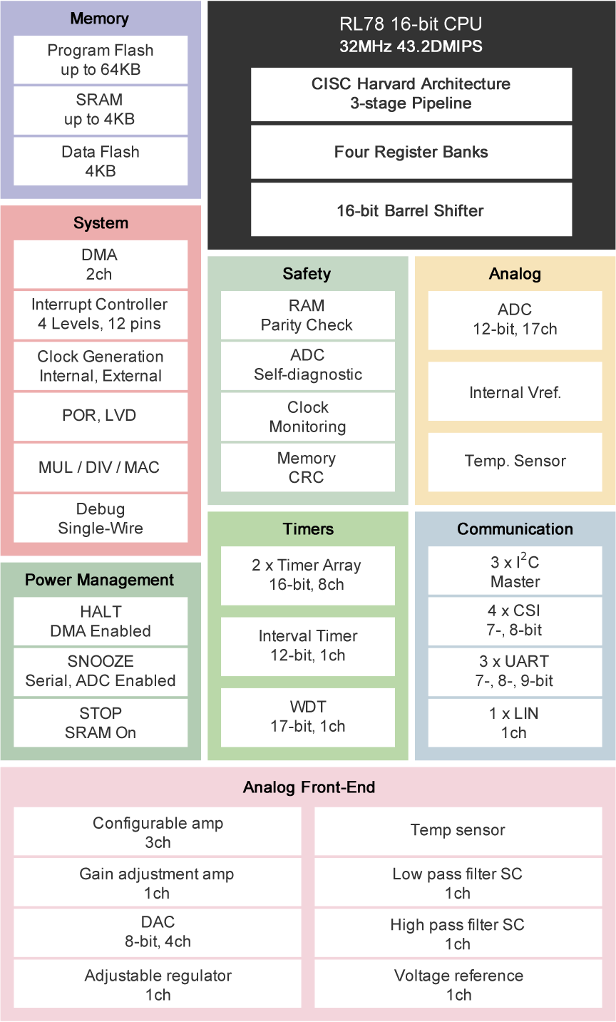 The RL78/G1E microcontroller is based on the RL78/G1A and has built-in analog front-end (AFE) for sensor applications. The AFE circuit contains configurable amplifiers capable of various amplifier configurations, a gain adjustment amplifier, filters, D/A converters, and a temperature sensor, which are suitable for processing small sensor signals.