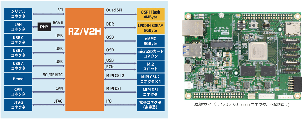 - Gigabit Ethernet×1、USBx3、M.2x1、microSDx1、MIPI CSI-2x4、MIPI DSIx1 などの豊富なインタフェースを搭載しており、RZ/V2Hの機能を最大限活かすことが可能