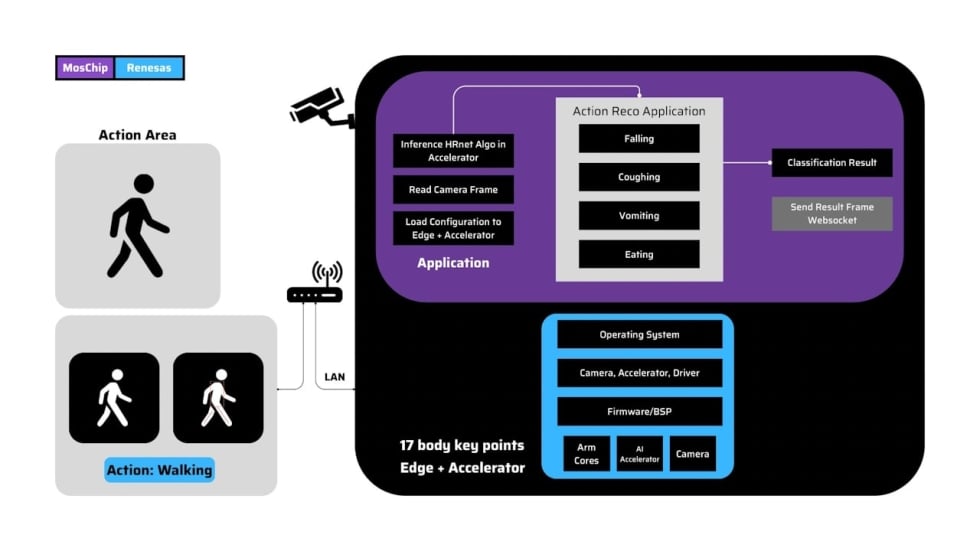 Action Recognition with pose estimation solution is developed and inferenced using RZ/V series vision MPUs with DRP-AI acceleration. This solution recognizes a person's actions with body key points from HRNet inferenced on DRP-AI. Actions were defined with certain body actions such as fallen, panic expressions, sick, eating, etc. This application can be inferenced using the RZ/V2MA vision board.