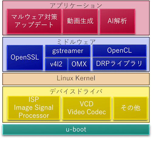- ブートローダー、Linuxカーネル、デバイスドライバ、ミドルウェア、アプリケーションの作成