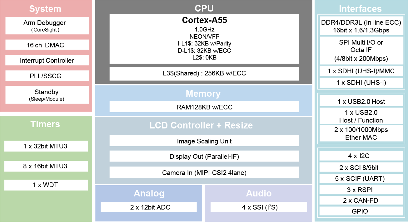 RZ/A3UL 能够让客户充分发挥实时操作系统 (RTOS) 的潜力,同时利用最大工作频率为 1GHz 的 64 位 Arm® Cortex®-A55 CPU 核心带来的性能提升。 它集成了一个 Octal-SPI 存储器接口,有助于简化电路板设计,使结构更小型化。 此外,还提供支持 DDR3L/DDR4 内存接口的版本,以实现高速的 DRAM 连接。