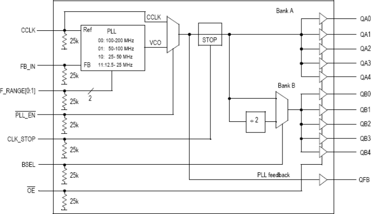 - Selectable divide-by-two for one output bank