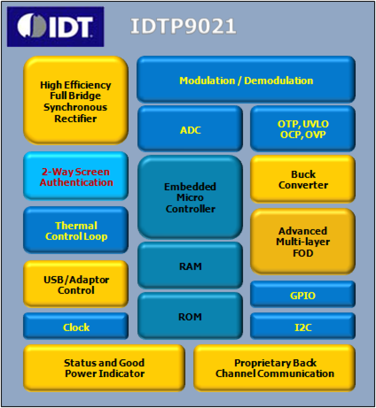 The IDT P9021 is a dual-mode single-chip wireless power receiver IC that complies with the requirements of both WPC “Qi” 1.0.1 and PMA Type 1 Interoperability specifications. The device functions to receive an AC power signal from a compatible wireless transmitter and convert it into a regulated 5V output voltage to provide direct power or supply the charger input in mobile applications. The P9021 integrates a high-efficiency synchronous full-bridge rectifier, high-efficiency synchronous buck converter, and control circuits used to modulate the load to transmit WPC or PMA-compliant message packets to the transmitter to optimize power delivery.