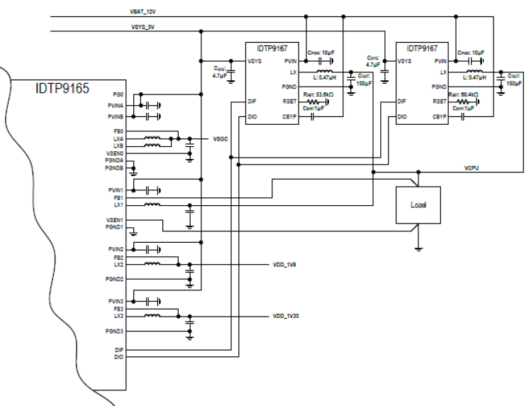 The IDT P9165 is a programmable, multi-channel power management IC (PMIC). It includes 5 integrated, synchronous, step-down DC/DC regulators, 11 LDOs, flexible sequencing, a Real Time Clock (RTC), a 10-bit ADC, eight GPIOs, and a high speed I2C interface. The product is ideal for multi-core SoCs, ASICs, FPGAs and other multi-rail applications and is specifically designed to support the power management requirements of mobile multi-core processor platforms. The P9165 supports the connection of up to eight P9167 distributed power units (DPUs) to efficiently scale the total peak output current of the DCD1. The distributed power units offer advantages for ease-of-routing, and heat distribution.