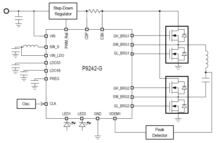 The P9242-G includes an under-voltage lockout and thermal management circuit to safeguard the device under fault conditions. Together with the P9221-R receiver (RX), the P9242-G forms a complete wireless power system solution.