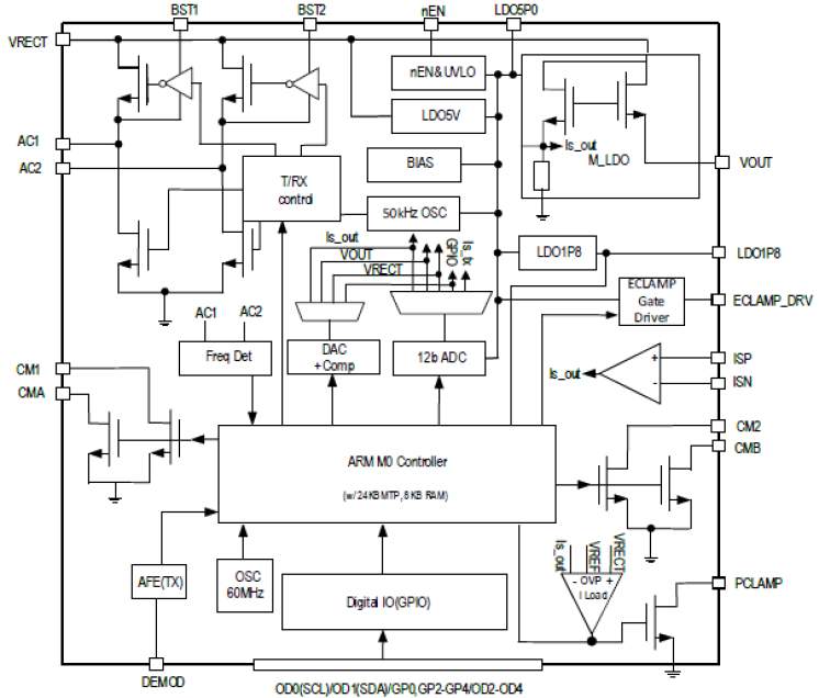 The P9418 is a highly-integrated single-chip wireless power transmitter/receiver IC (TRx). The device can be configured to receive or transmit an AC power signal through magnetic induction.