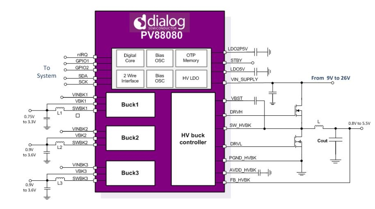 In certain applications, multiple PV88080s can be used together to provide enough power rails to power the larger systems. There are three buck converters that can be used to generate the supplies for CPUs, DDR memory and other auxiliary functions in a typical application. The pass devices of these buck converters are fully integrated, so no external FETs or Schottky diodes are needed. This results in optimized power efficiency and a reduced external component count.