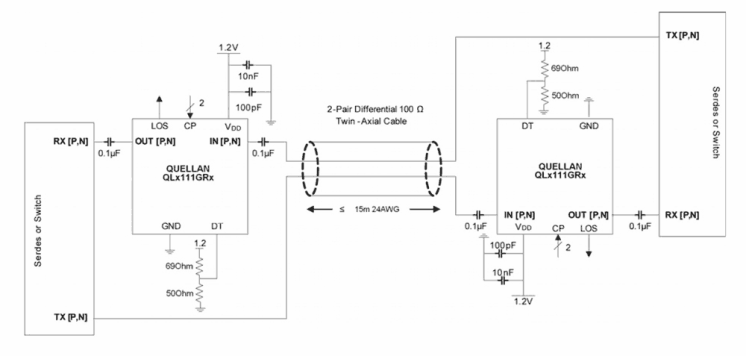 The QLx111GRx is a settable single-channel receive-side equalizer with extended functionality for advanced protocols operating with line rates up to 11. 1Gb/s such as 10G Ethernet (10GBase-CR). The QLx111GRx compensates for the frequency dependent attenuation of copper twin-axial cables, extending the signal reach up to at least 10m on 28AWG cable. The small form factor, highly-integrated design is ideal for high-density data transmission applications including active copper cable assemblies. The equalizing filter within the QLx111GRx can be set to provide optimal signal fidelity for a given media and length. The compensation level for the filter is set by two external control pins. Operating on a single 1. 2V power supply, the QLx111GRx enables per channel throughputs of 10Gb/s to 11. 1Gb/s while supporting lower data rates including 8. 5, 6. 25, 5, 4. 25, 3. 125, and 2. 5Gb/s. The QLx111GRx uses current mode logic (CML) input/output and is packaged in a 3mmx3mm 16 lead QFN. LOS support is included for module applications.