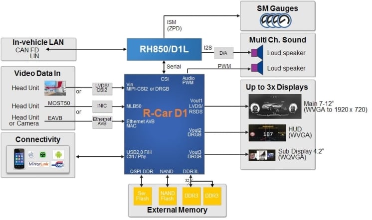 - If gauge control is required, system manufacturers can combine the R-Car D1 with the RH850/D1M to implement such systems