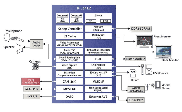 To meet these requirements, Renesas developed the R-Car E2 solution to deliver optimized infotainment and display audio for entry-level integrated cockpit systems. In combination with other second-generation Renesas R-Car Series devices (R-Car H2, M2, E2, and V2H), this helps achieve the scalability required to bridge the full range of integrated cockpit systems from entry-level to high-end models.