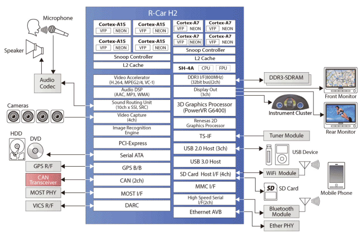 - Achieves the industry's highest performance for an SoC for car information systems of over 25000 DMIPS (double that of the R-Car H1 )