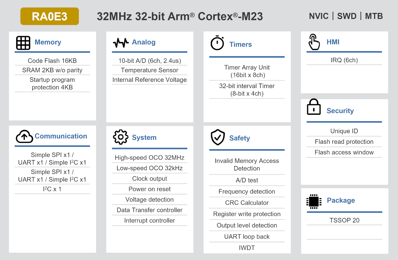 RA0E3 是一款高性价比的入门级通用微控制器 (MCU),专为要求简单、高效和可靠性能的低引脚数应用而设计。 RA0E3 基于 Arm® Cortex®-M23 内核,具有超低功耗、精简外设和优化的架构,能够降低 BOM 成本,加快低端 MCU 市场的开发速度。