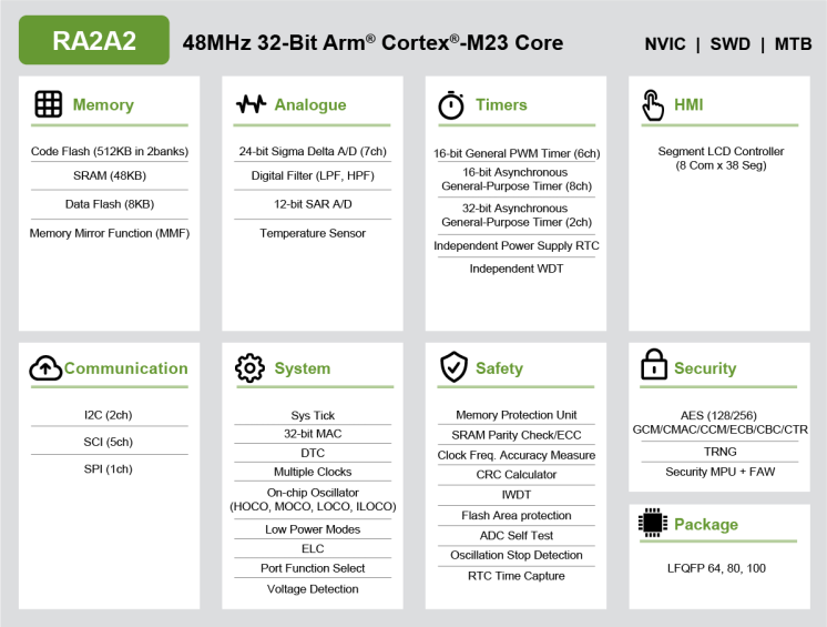 RA2A2 系列是一款低功耗微控制器,结合了 48MHz Arm® Cortex®-M23 内核和丰富的外设功能。 RA2A2 MCU 支持段式 LCD 和高精度模拟功能,同时降低功耗、系统成本和整体尺寸,优化功能,适合广泛应用。 此外,RA2A2 的双组闪存和信息安全功能使固件更新变得容易并提高了系统可靠性。