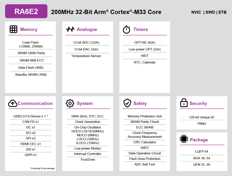 RA6E2组是RA6系列中最新的入门级微控制器,基于带有TrustZone®的200MHz Arm® Cortex®-M33内核。
