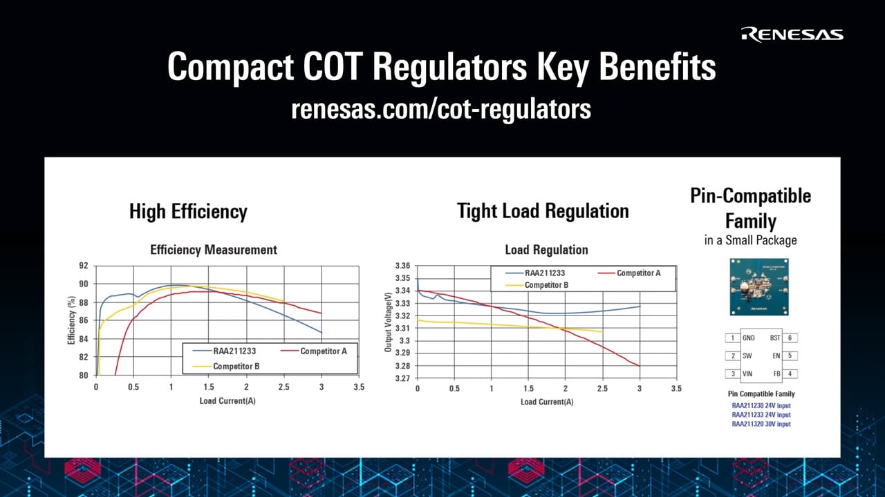 瑞萨电子的 RAA211230/320 系列同步降压稳压器集成了电流模式恒定导通时间 (COT) 控制功能,可实现快速瞬态响应,并缩小输出滤波器尺寸。请访问 renesas.com/cot-regulators 进一步了解这些高性能、结构紧凑、引脚兼容的 COT 稳压器,让您轻松实现电源设计!