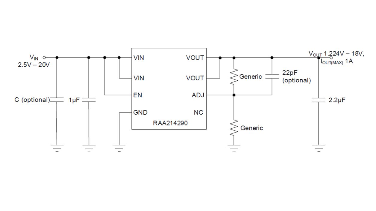 The RAA214290 is a low-dropout linear voltage regulator that operates from 2.5V to 20V and provides up to 1A of output current with a typical dropout of 269mV. The output voltage is adjustable with external feedback resistors anywhere from 1.224V to 18V.