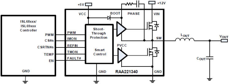 SPS 具有 3.3V 兼容型三态 PWM 输入,可与瑞萨电子多相 PWM 控制器配合使用,在异常工作条件下提供可靠的解决方案。 SPS 还集成了 UVLO、短路 HFET、过温和过流的故障保护功能,提高了系统性能和可靠性。 漏极开路故障报告引脚简化了 SPS 和控制器之间的握手过程,并可在启动和故障条件下禁用控制器。