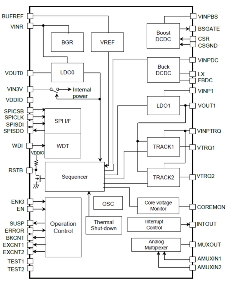 RAA270005KFP 是一款适用于 RH850 汽车微控制器系列的电源管理 IC (PMIC)。RAA270005KFP 包含一个带外部 MOSFET 的升压 DC-DC 转换器、一个作为预稳压器的降压 DC-DC 转换器、两个低压差线性稳压器 (LDO) 和两个线性跟踪器。升压 DC-DC 转换器和降压 DC-DC 转换器的开关频率分别为 420kHz 和 2.1MHz。同时实现了稳压器的过压、欠压检测和外部微控制器的看门狗等多种监测功能和诊断功能。RAA270005KFP 的输入电压、所有稳压器的输出以及与温度对应的内部模拟电压均可通过外部微控制器中的 ADC 进行监控。由于 RAA270005KFP 包含一个通电/断电顺序控制器,用户可以减少用于控制目标微控制器通电/断电顺序的外部组件。RAA270005KFP 还可控制微控制器的外部备用电源。