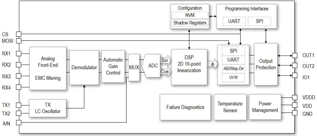 - Output interfaces: SPI, high-speed UART (up to 2Mbit/s), ABI, step/dir, AB/PWM, and UVW