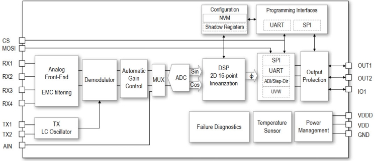 - 输出接口:SPI、高速 UART(高达 2Mbit/s)、ABI、步进/方向、AB/PWM 和 UVW