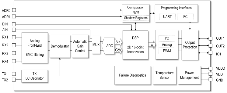 RAA2P4200 是一款工业级无磁电感式位置传感器 IC,可支持 旋转、线性或弧形 位置检测。 该器件以电涡流效应为工作原理,通过检测在线圈组(由一根发射线圈和两根接收线圈组成)上方移动的简易金属目标的位置实现定位。
