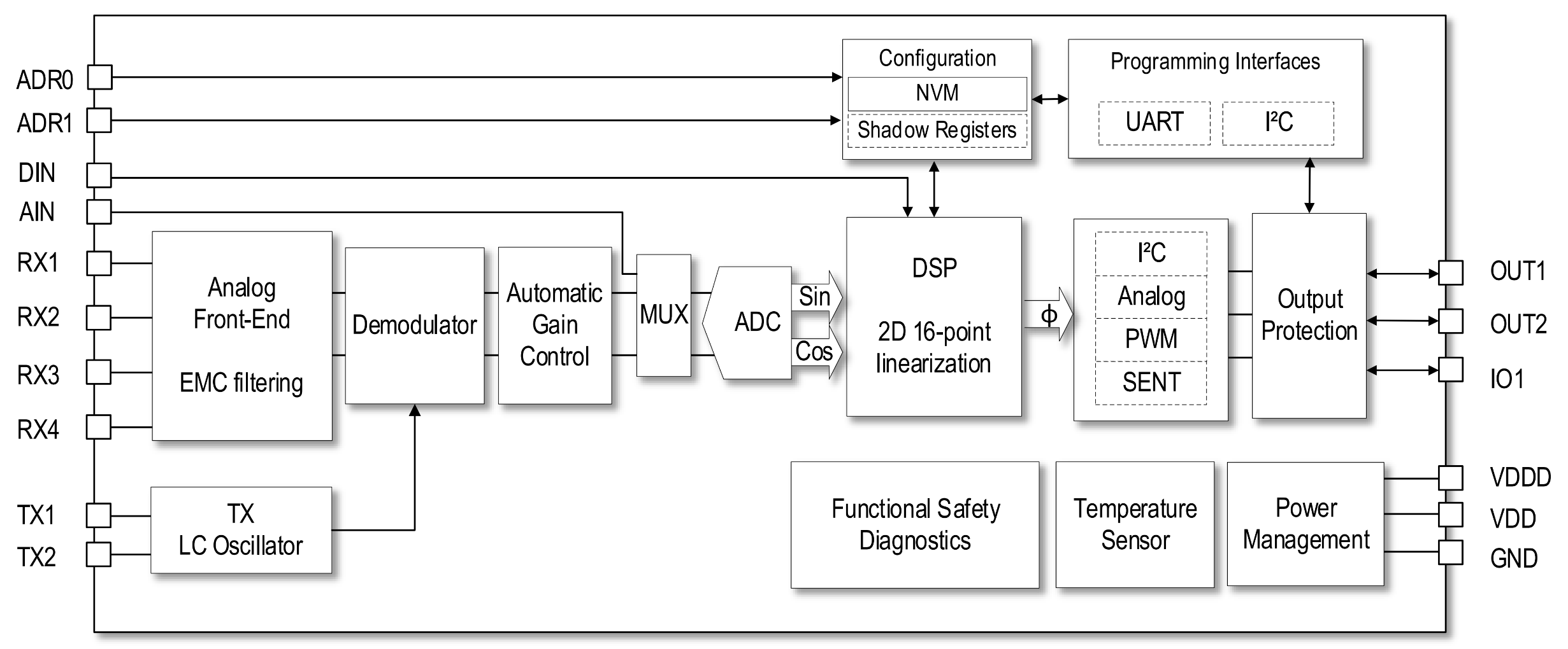 | Interface | I2C, Analog, PWM, SENT |