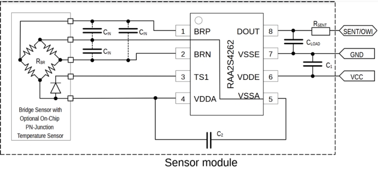 RAA2S4267 是一款具有 SENT 输出的顶级汽车压力传感器信号调理芯片 (SSC),专为差分桥传感器信号的精确放大和校正而设计。 它具有出色的精度和可靠性,具有出色的模拟前端放大和传感器零漂校正功能,使其适用于几乎所有电阻电桥。 先进的信号处理功能利用 16 位 RISC 微控制器进行精确的调节计算,并将数据存储在非易失性存储器中。 通过数字 SENT 接口确保可靠的数据传输,通过单个输出引脚提供可靠的传输。 该产品专为恶劣环境而设计,具有强大的保护电路、出色的电磁兼容性和全面的诊断功能。 此外,RAA2S4267 还支持下线校准,并提供 OWI 接口,用于简单的配置和校准。